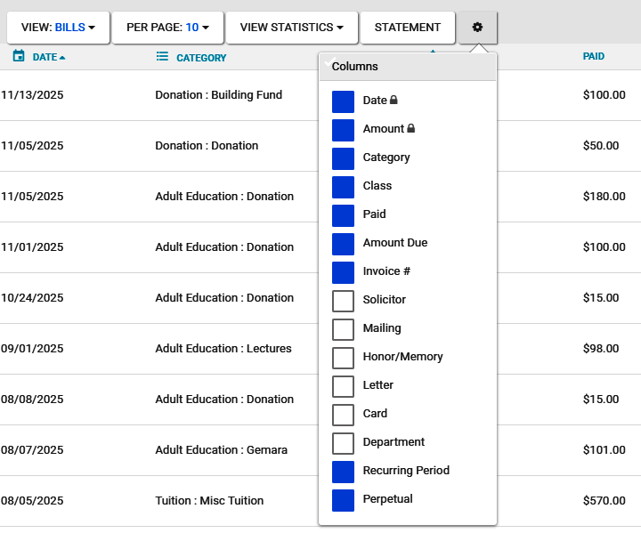 Choose Columns for Bills and Payments